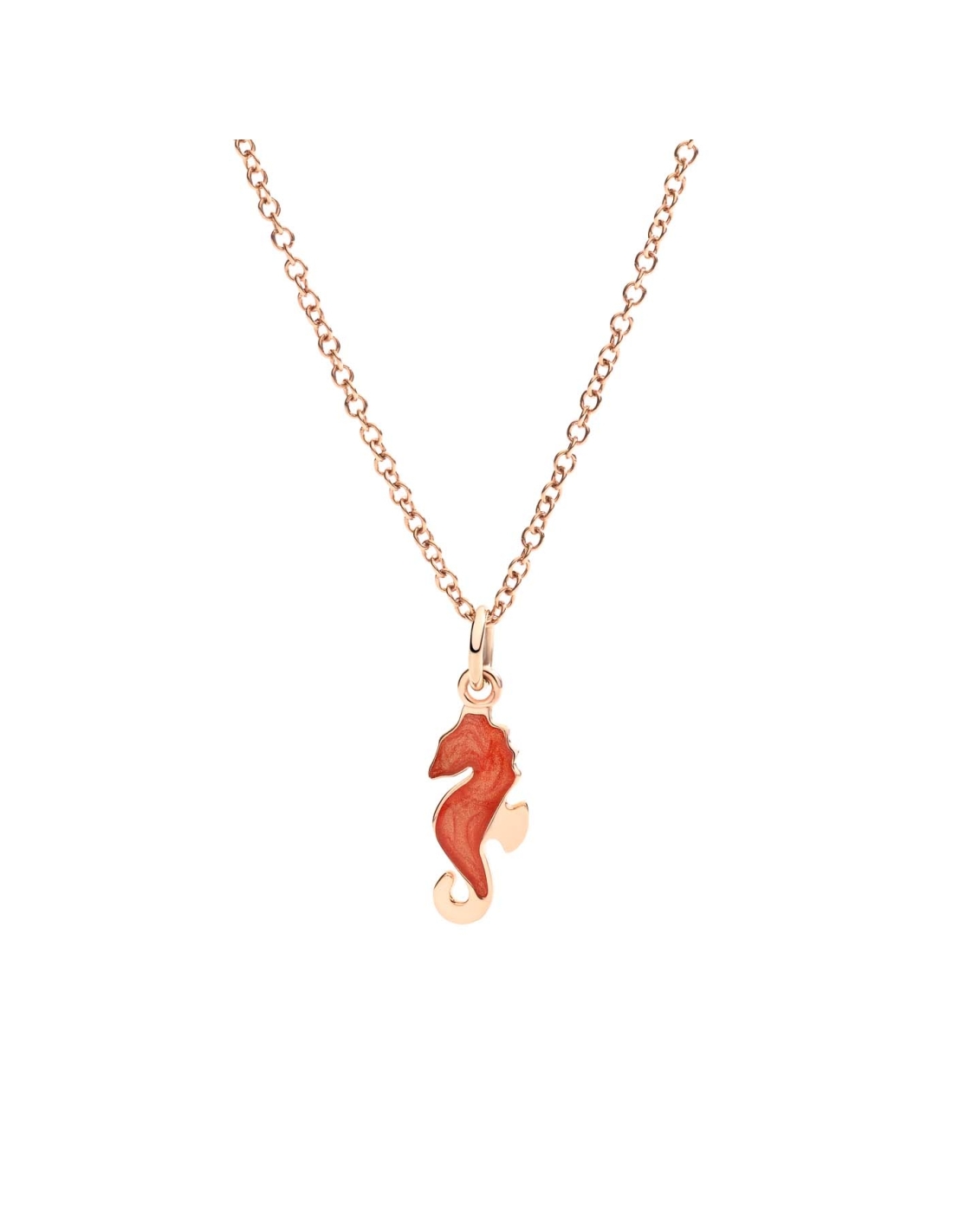 Ciondolo cavalluccio marino in oro rosa 9K con smalto arancione effetto madreperla.