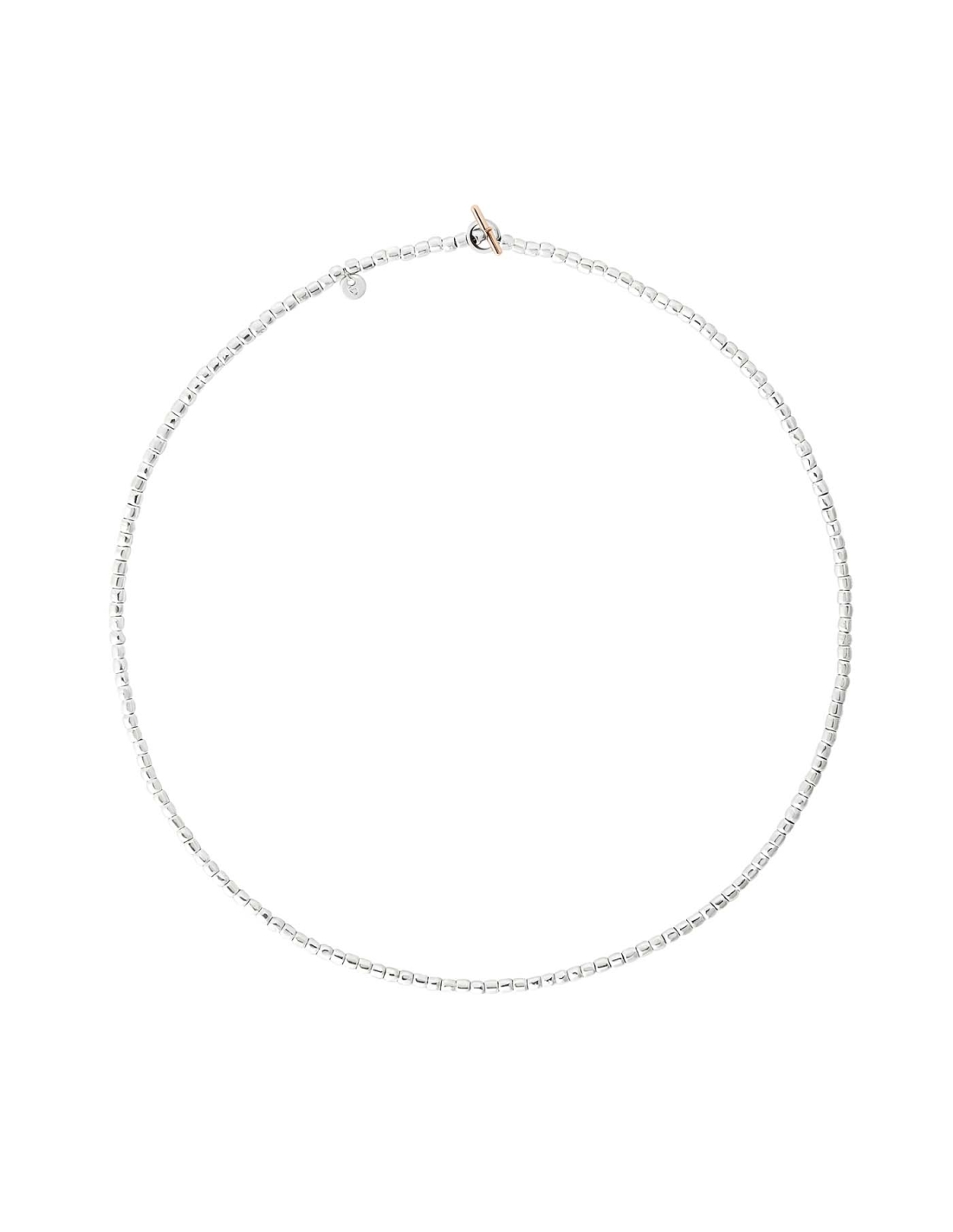 Collana mini Granelli in argento 925 con catena e anello brisè in acciaio e t-bar in oro rosa 9K. Piastrine in argento e acciaio. Ago in acciaio incluso.