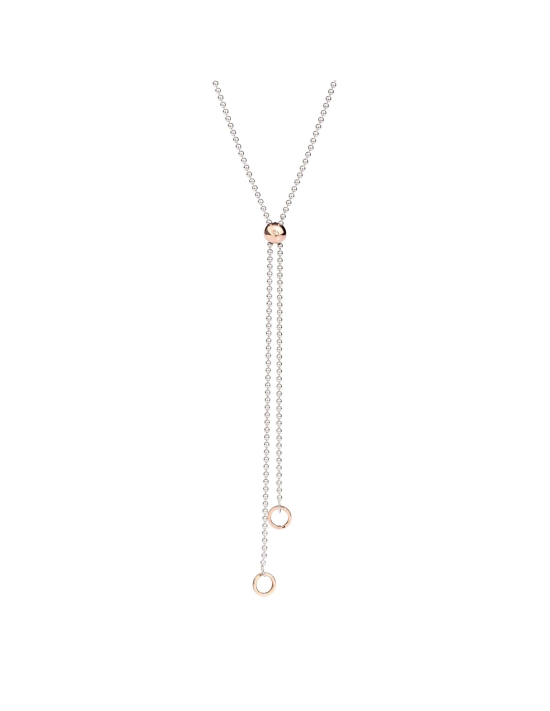 Collana lariat Bollicine in argento 925 con slider e anelli brisè in oro rosa 9K. Piastrine in argento 925 e oro rosa 9K.