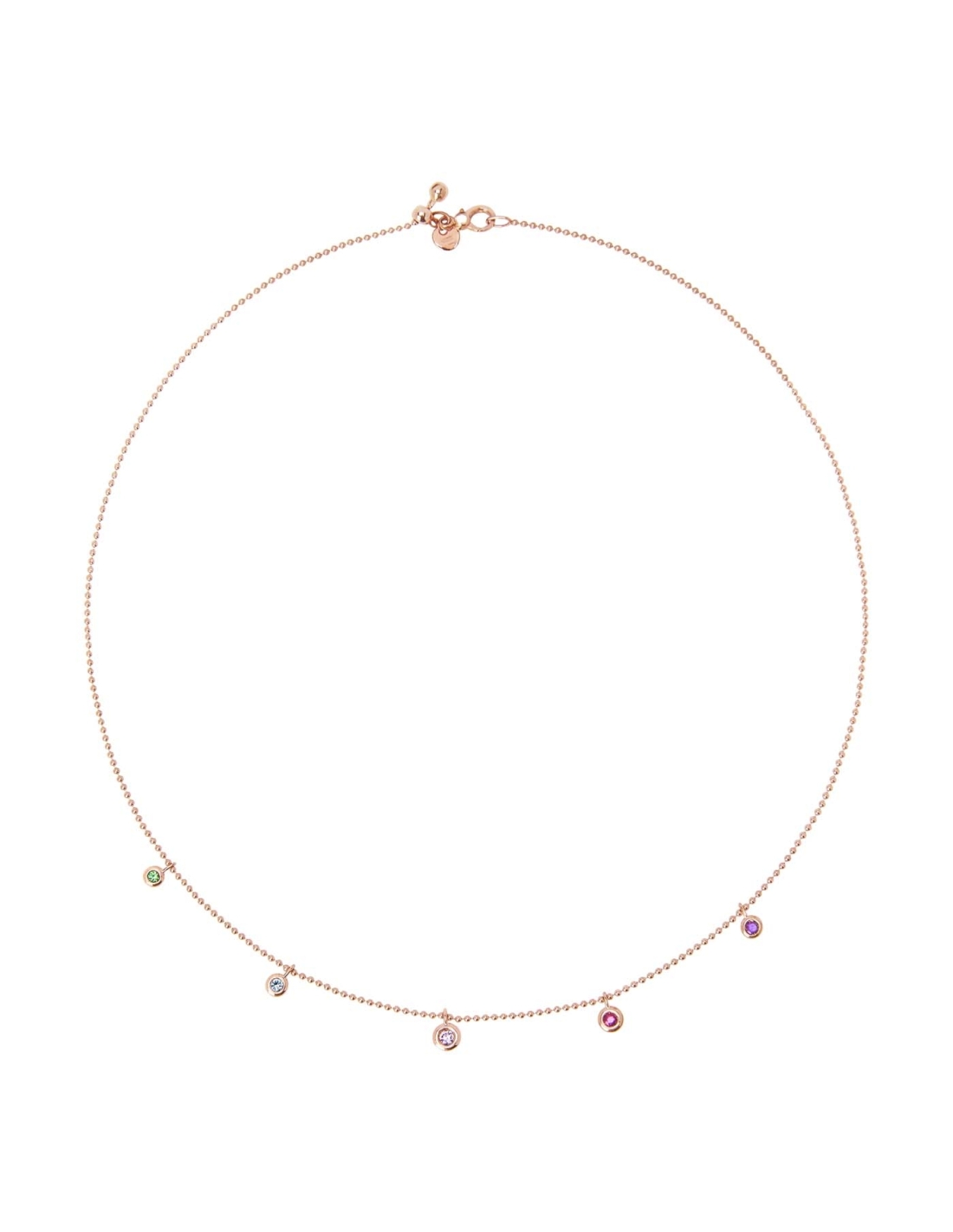 Collana Bollicine in oro rosa 9K con 1 tsavorite (ct 0.02), 1 topazio azzurro (ct 0.03), 1 zaffiro rosa (ct 0.08), 1 rubino (ct 0.06), 1 ametista (ct 0.04) e chiusura con slider in oro rosa 9K e silicone. Piastrina in oro rosa 9K.