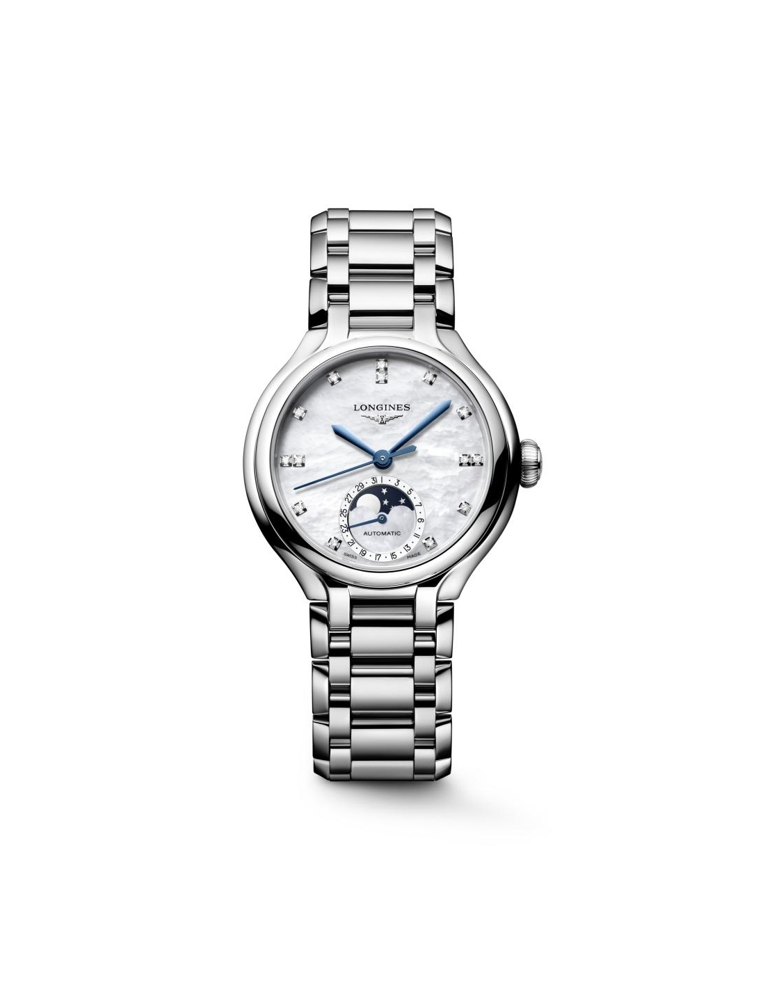 Longines PrimaLuna Moonphase, Automatico, diam. 34.00 mm, Acciaio inossidabile, Quadrante in madreperla bianca con diamanti.