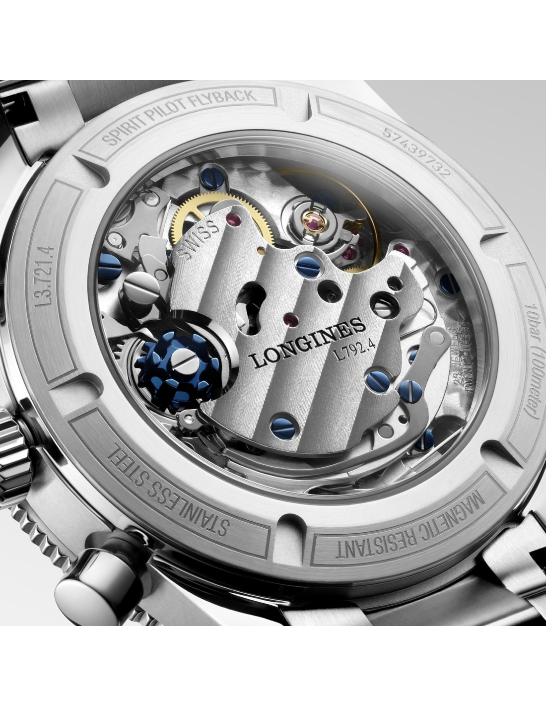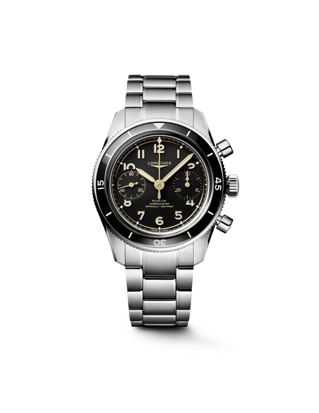 LONGINES SPIRIT PILOT FLYBACK, L3.721.4.53.6, orologio manuale, diam. 39.50 mm, acciaio inossidabile e lunetta in ceramica. Cronografo flyback, movimento meccanico a carica manuale che batte a 28.800 alternanze all’ora, con una riserva di carica di circa 68 ore. Lunetta girevole bidirezionale, impermeabile fino a 10 bar, vetro zaffiro antigraffio con trattamento antiriflesso multistrato su entrambi i lati. Quadrante nero mat, swiss super-luminova. Bracciale in acciaio inossidabile, con doppia chiusura deployante di sicurezza con sistema di microregolazione.